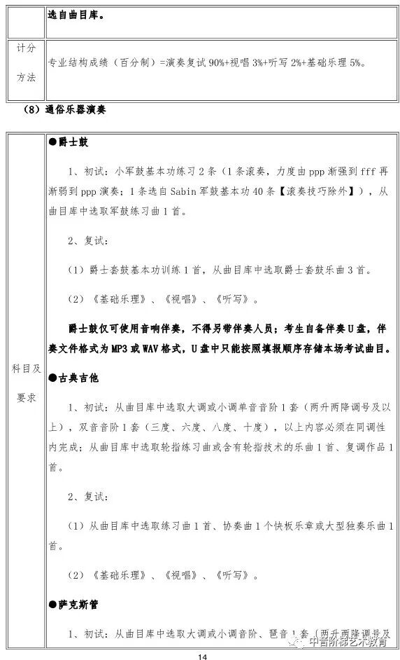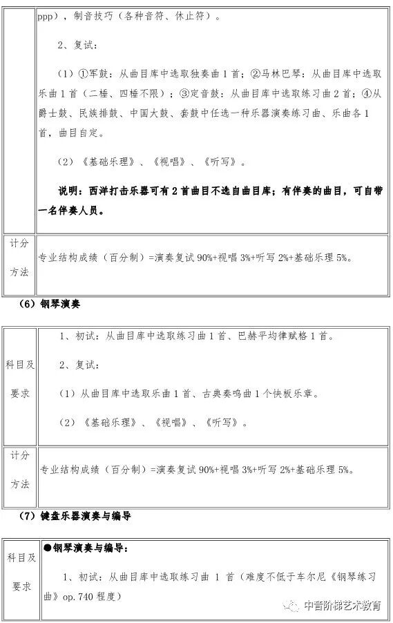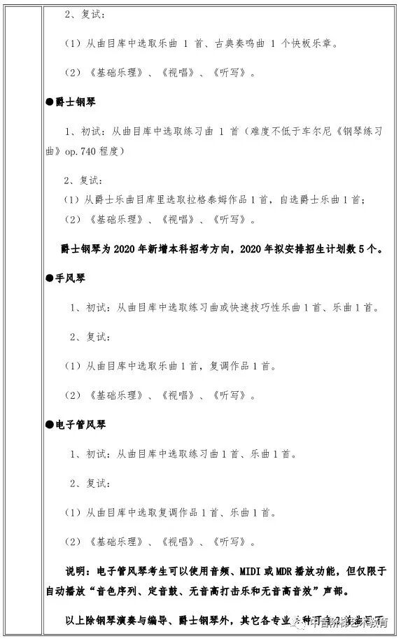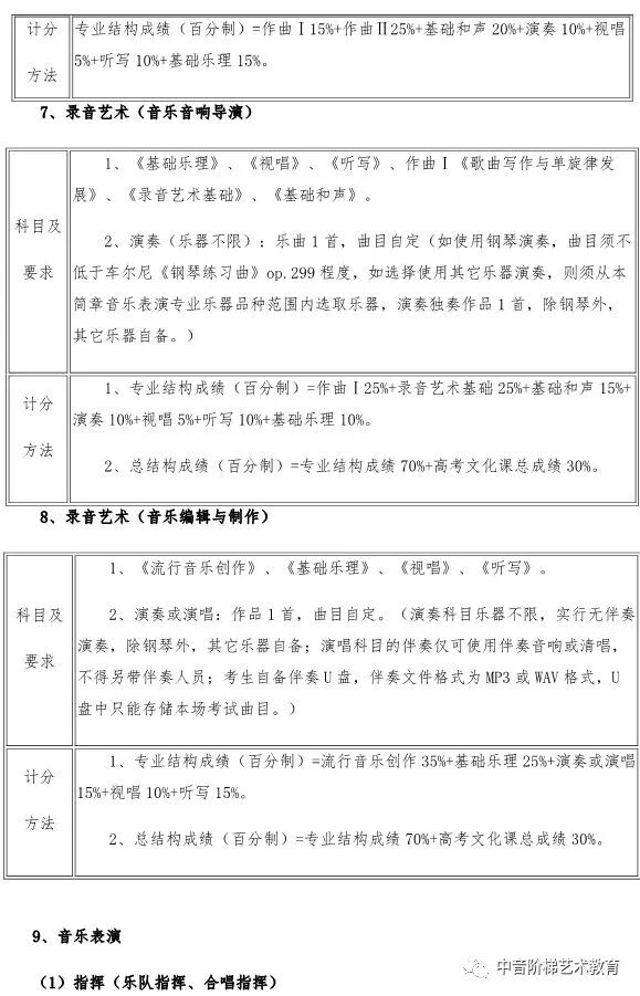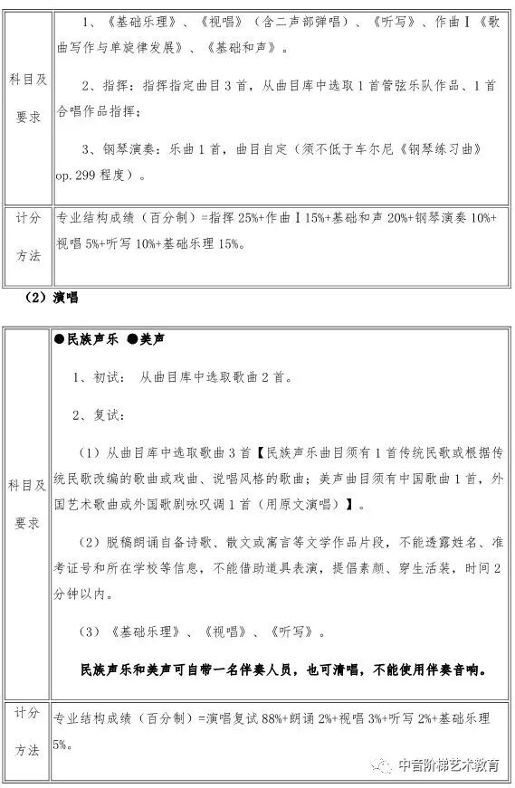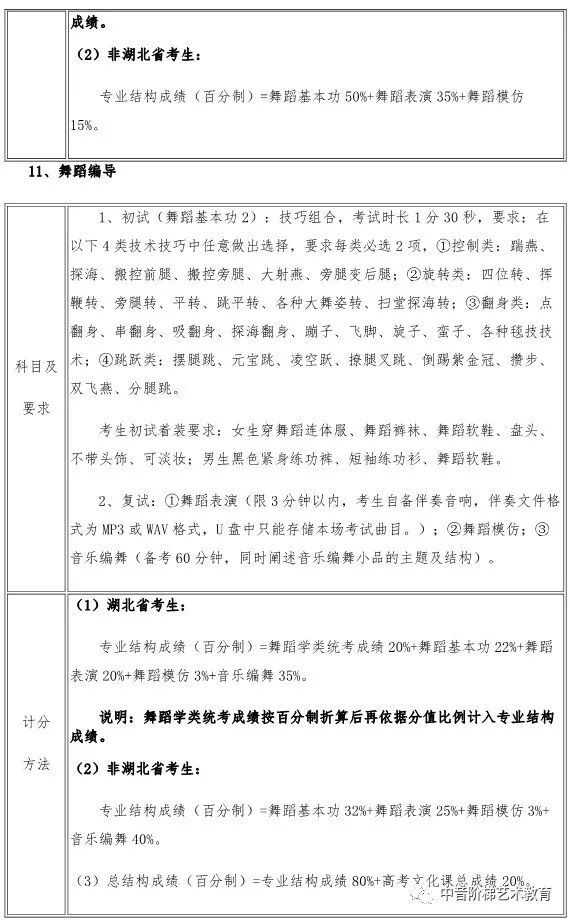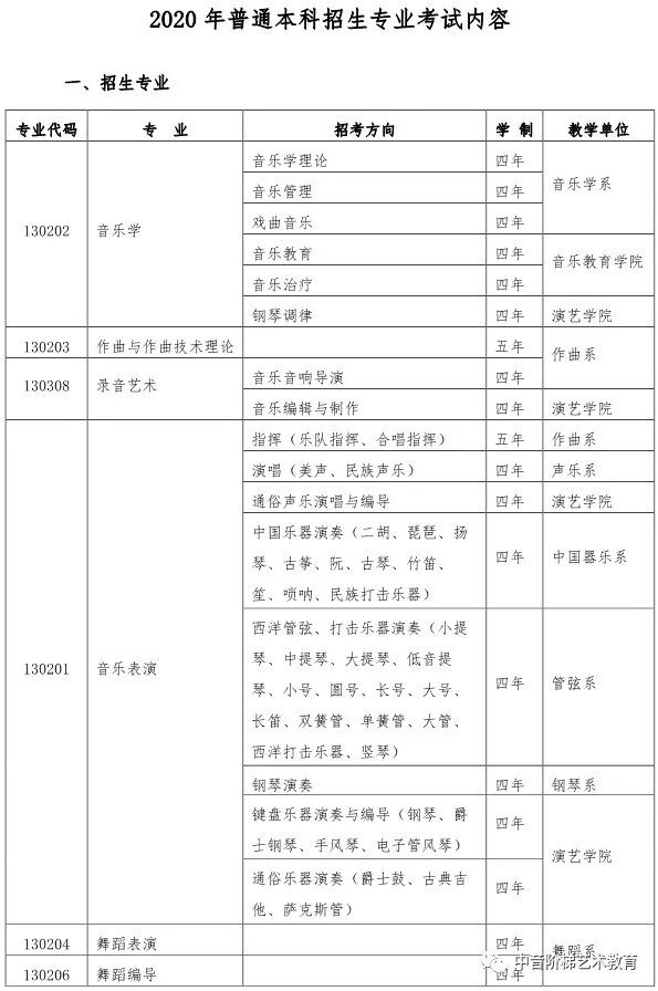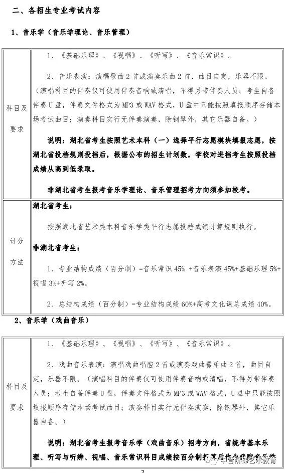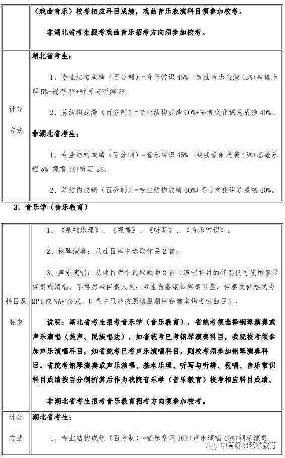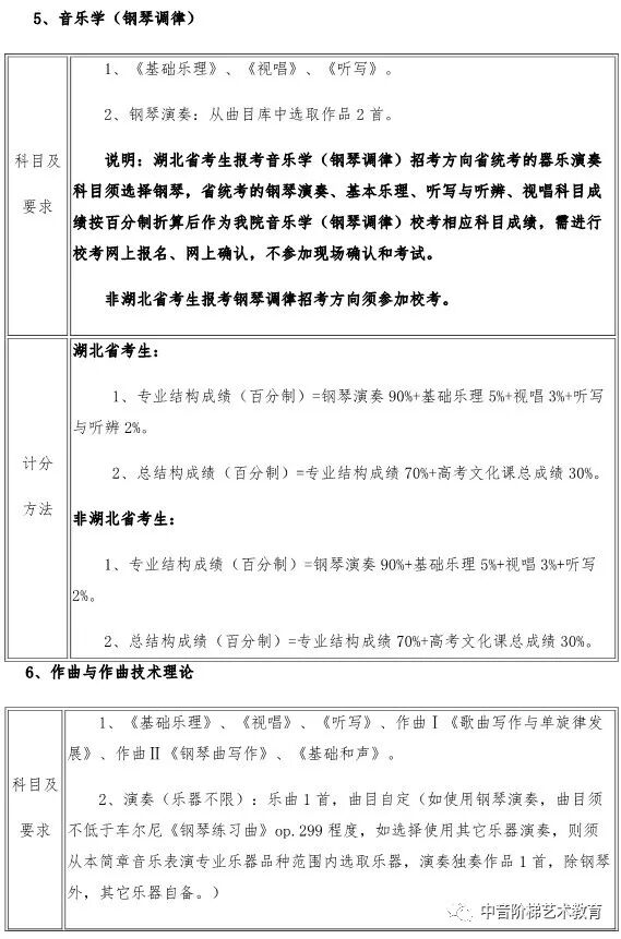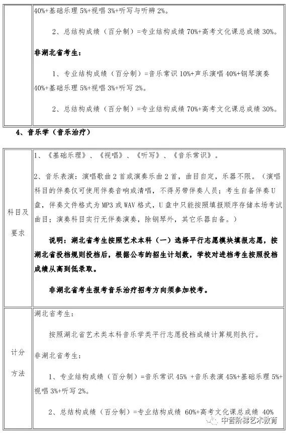 武汉音乐学院2020年本科招生政策调整 一、关于普通本科招生校考报考方向限额调整的说明 每位考生报我校2020年普通本科校考,限报两个招考方向。 二、关于湖北省考生报考音乐学(音乐学理论、音乐管理、音乐治疗)方向招生方式调整的说明 2020年,湖北省考生报考我校音乐学(音乐学理论、音乐管理、音乐治疗)方向不需要进行校考专业考试网上报名,将使用湖北省音乐学类统考成绩录取,安排在湖北省艺术本科(一)平行志愿模块招生。 三、关于湖北省考生填报高考志愿时志愿模块选择的说明 湖北省艺术本科(一)设有两个志愿模块,即梯度志愿模块和平行志愿模块。梯度志愿模块用于填报使用校考合格证录取的院校(专业)志愿,平行志愿模块用于填报使用省统考成绩的院校(专业)志愿。 2020年,湖北省考生报考我校音乐学(音乐学理论、音乐管理、音乐治疗)招生专业安排在艺术本科(一)平行志愿模块招生;报考我校音乐学(音乐教育、戏曲音乐、钢琴调律)、作曲与作曲技术理论、录音艺术、音乐表演、舞蹈表演、舞蹈编导专业的考生安排在艺术本科(一)梯度志愿模块招生。考生填报艺术本科(一)志愿时,根据自己的考试成绩和升学意愿,在梯度志愿模块和平行志愿模块之间选择一个志愿模块填报,不能同时填报平行志愿模块和梯度志愿模块。具体招生政策可查阅湖北省高等学校招生委员会发布艺术类招生工作有关通知。 四、关于新增招生方向的说明 2020年,我校普通本科招生新增音乐表演(爵士钢琴)、音乐表演(古琴)方向,具体考试内容及要求以我校发布《2020年普通本科招生专业考试内容》为准。 五、关于音乐表演(通俗声乐演唱与编导)方向调整的说明 2020年,音乐表演(通俗声乐演唱与编导)方向不再区分民族声乐唱法、美声唱法、通俗唱法,统一按照新发布的音乐表演(通俗声乐演唱与编导)方向考试内容及要求考试。音乐表演(通俗声乐演唱与编导)方向招生计划统一安排,不再按三种唱法分别分配、分别录取。 六、关于普通本科招生部分专业考试内容及要求调整的说明 2020年,我校对音乐学(音乐治疗)、音乐表演(通俗声乐演唱与编导、钢琴演奏与编导)、录音艺术(音乐音响导演)、录音艺术(音乐编辑与制作)、舞蹈表演、舞蹈编导等专业招生考试内容及要求进行部分调整,具体考试内容及要求以我校发布《2020年普通本科招生专业考试内容》为准。 七、关于音乐学(音乐学理论)方向学制调整的说明 2020年,音乐学(音乐学理论)方向学制调整为四年。 八、关于音乐学(音乐学理论、音乐管理、戏曲音乐、音乐治疗)方向的总结构成绩比例权重调整的说明 2020年,音乐学(音乐学理论、音乐管理、戏曲音乐、音乐治疗)方向总结构成绩权重比例调整为:总结构成绩(百分制)=专业结构成绩60%+高考文化课总成绩40%。 如果你对音乐专业有任何问题, 点击文末左下角“阅读原文”在线咨询 关注“中音阶梯艺术教育” 回复关键词查看更多内容 回复“分数线”查看2020年全国各省份艺术类及11大音乐学院文化录取分数线。 回复“统考/联考”,查看2020省统考考试时间地点和全国最新承认音乐统考成绩院校名单。 回复“音乐学院”,查看11大音乐学院2019年招考信息。 回复“师范”,查看全国师范类院校推荐及音乐类分数线。 回复“附中”查看音乐学院附中2019年报考信息。 回复“特长生”,查看高校2019年高水平艺术团招生项目及降分政策。 回复“招生简章”查看各大院校2019年音乐类招生简章