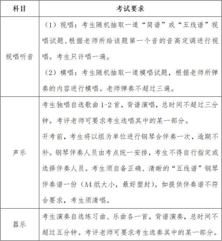重要提醒:音乐类专业省统考报名信息网上输入时,考生须按要求选定一种声乐唱法和一种乐器;考试时须与报名时选择的声乐唱法和乐器相一致,否则该科目不予评分。考生所需乐器(除钢琴外)一律自备。